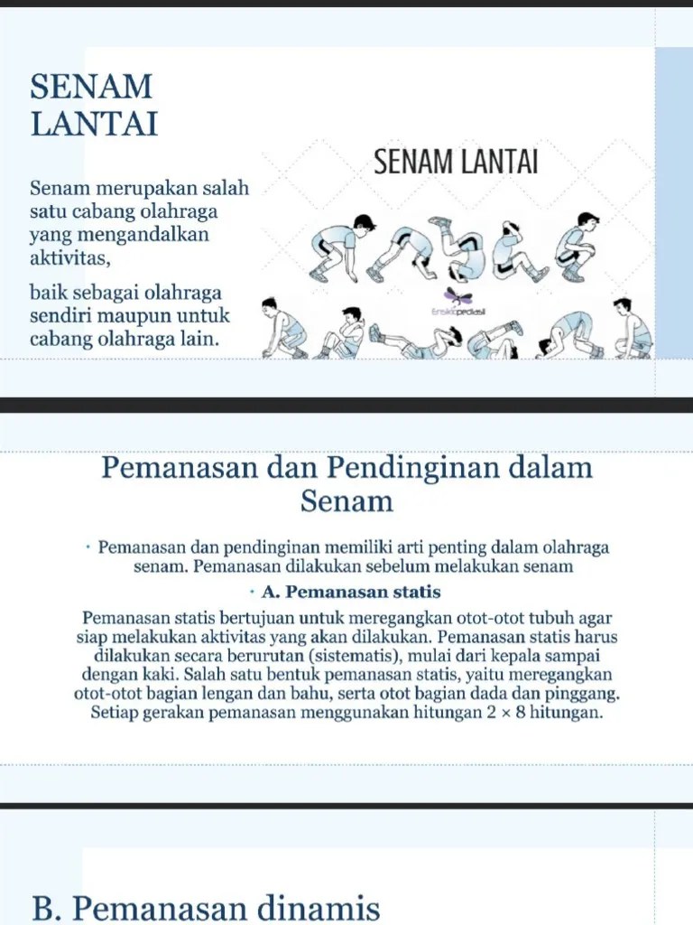 Pekerja melakukan pekerjaan yang statis dan monoton dalam waktu yang lama selama 6 hari kerja dengan waktu istirahat kerja selama 60 menit perhari. Gerakan dinamis secara optimal dalam ruang gerak suatu sendi. Mitra keseluruhan dapat menerima model latihan peregangan statis dan dinamis dan melakukan senam low impact yang dipandu melalui aplikasi whatsapp. Rpp ini memuat tentang materi pola gerak dasar statis dan dinamis dalam aktivitas senam untuk siswa kelas 3 sekolah dasar. Normal dan gerakan yang dilakukan tersebut tidak menyebabkan cedera.