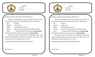 Dengan hormat, bersama dengan ini kami mengharapkan kehadiran seluruh pemuda pemudi rw.05 untuk . Anggota karang taruna perihal : Contoh undangan rapat karang taruna 17 agustusan. Karang taruna adalah organisasi sosial kemasyarakatan sebagai wadah dan sarana pengembangan setiap . Surat undangan pertemuan karang taruna bintim manokwari academia edu contoh surat undangan karang taruna docx 4 contoh surat undangan resmi .