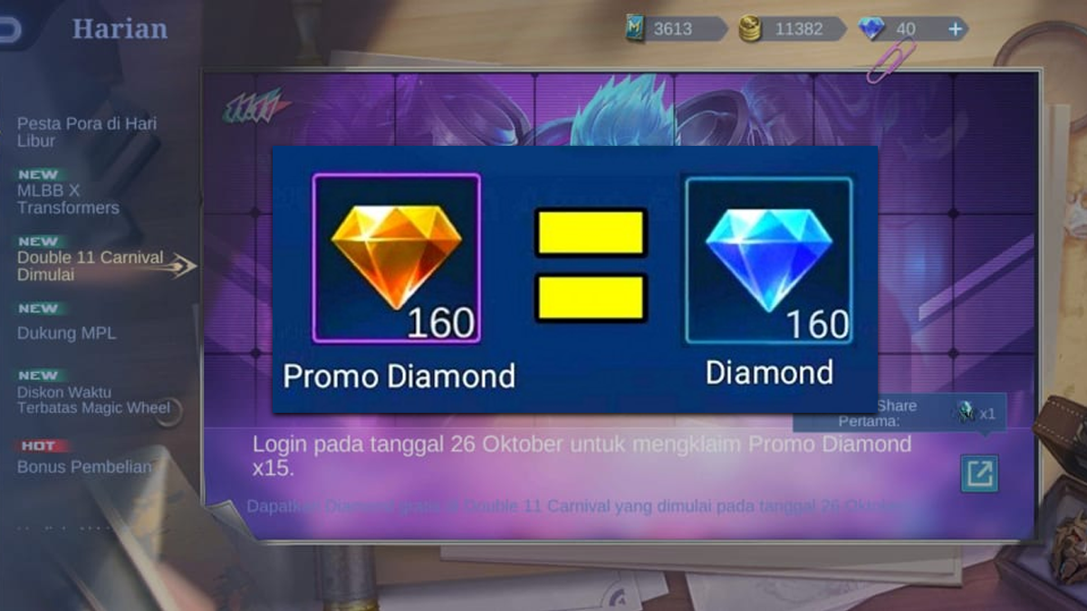 The diamond promo is one of the items that makes it easy for you to buy items, be it skins or others in mobile legends, the function itself is . Promo diamond activated today november 11! Promo mulai dari voucher, diskon, atau cashback untuk top up diamond mobile legends di google play pakai gopay, cuma sekali klik langsung di aplikasi. Get extra promo diamonds here (claim now)! Tersedia ✓ gratis ongkir ✓ pengiriman sampai .